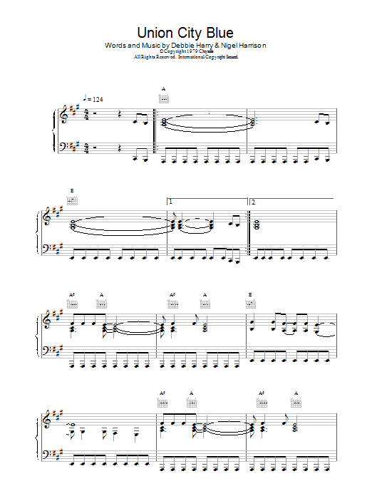 Download or print Blondie Union City Blue sheet music, chords and digital score arranged for Lead Sheet / Fake Book. This Pop score includes 2 page(s).