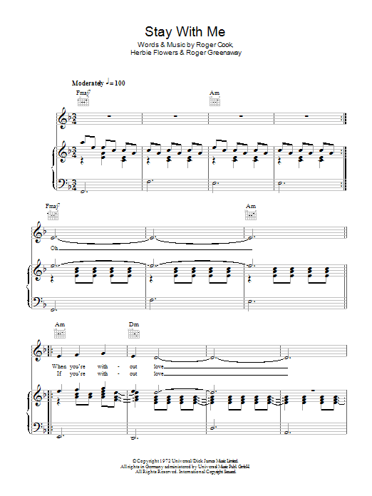 Download or print Blue Mink Stay With Me sheet music, chords and digital score arranged for Piano, Vocal & Guitar Chords. This Pop score includes 4 page(s).