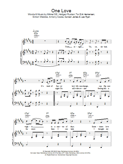 Download or print Blue One Love sheet music, chords and digital score arranged for Piano Chords/Lyrics. This Pop score includes 2 page(s).