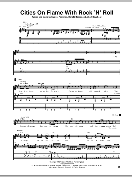 Download or print Blue Oyster Cult Cities On Flame With Rock 'N' Roll sheet music, chords and digital score arranged for Easy Guitar Tab. This Metal score includes 3 page(s).