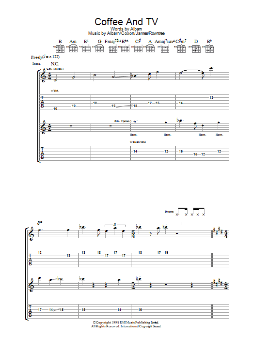 Download or print Blur Coffee & TV sheet music, chords and digital score arranged for Guitar Tab. This Pop score includes 9 page(s).