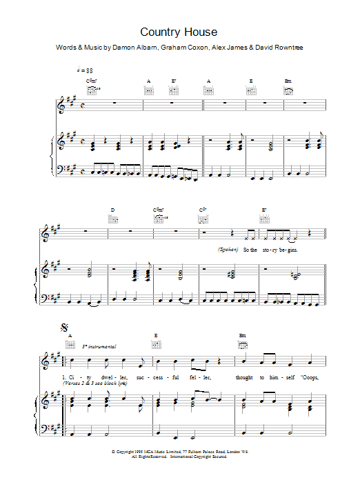 Download or print Blur Country House sheet music, chords and digital score arranged for Piano, Vocal & Guitar Chords. This Alternative score includes 7 page(s).