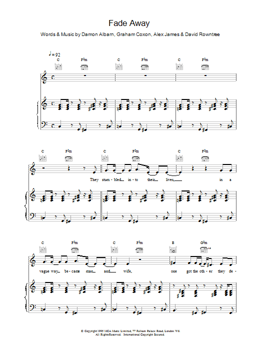 Download or print Blur Fade Away sheet music, chords and digital score arranged for Piano, Vocal & Guitar Chords. This Alternative score includes 6 page(s).