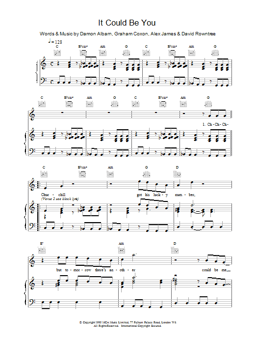 Download or print Blur It Could Be You sheet music, chords and digital score arranged for Piano, Vocal & Guitar Chords. This Alternative score includes 4 page(s).