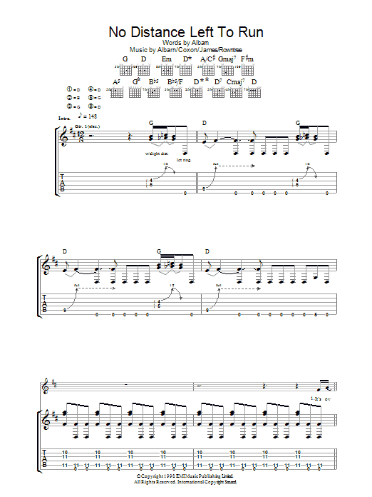 Download or print Blur No Distance Left To Run sheet music, chords and digital score arranged for Guitar Tab. This Pop score includes 5 page(s).