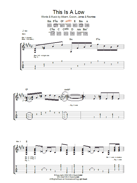 Download or print Blur This Is A Low sheet music, chords and digital score arranged for Guitar Chords/Lyrics. This Rock score includes 2 page(s).