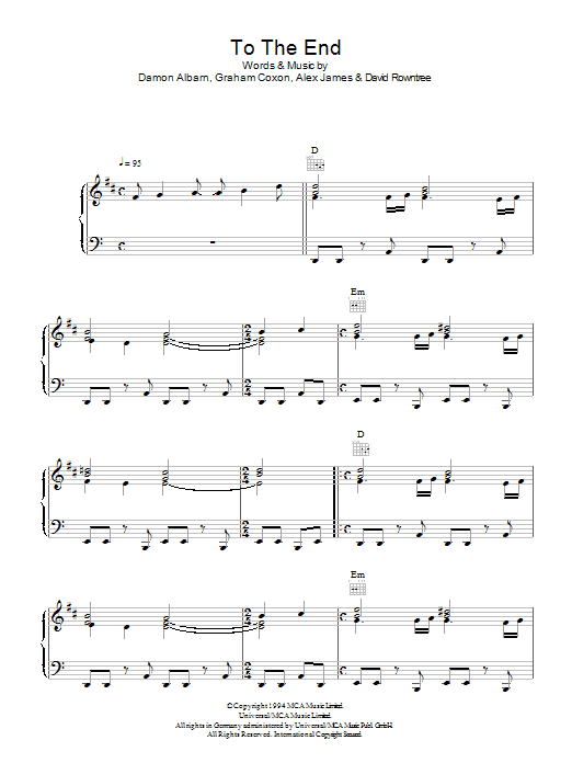 Download or print Blur To The End sheet music, chords and digital score arranged for Piano, Vocal & Guitar Chords. This Pop score includes 5 page(s).
