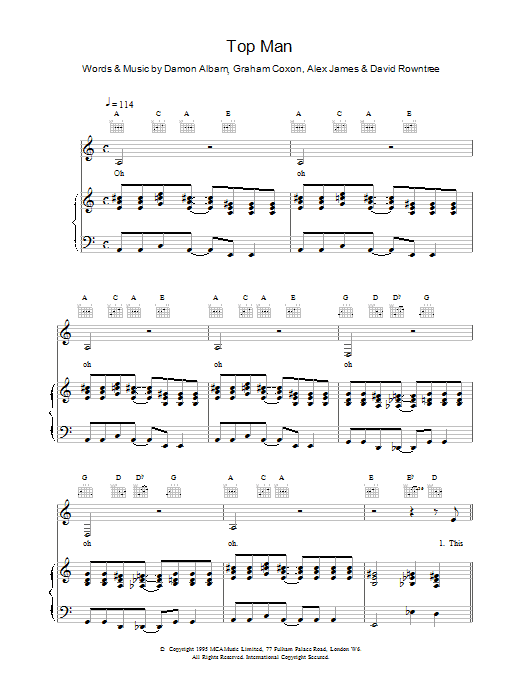Download or print Blur Top Man sheet music, chords and digital score arranged for Guitar Chords/Lyrics. This Rock score includes 3 page(s).