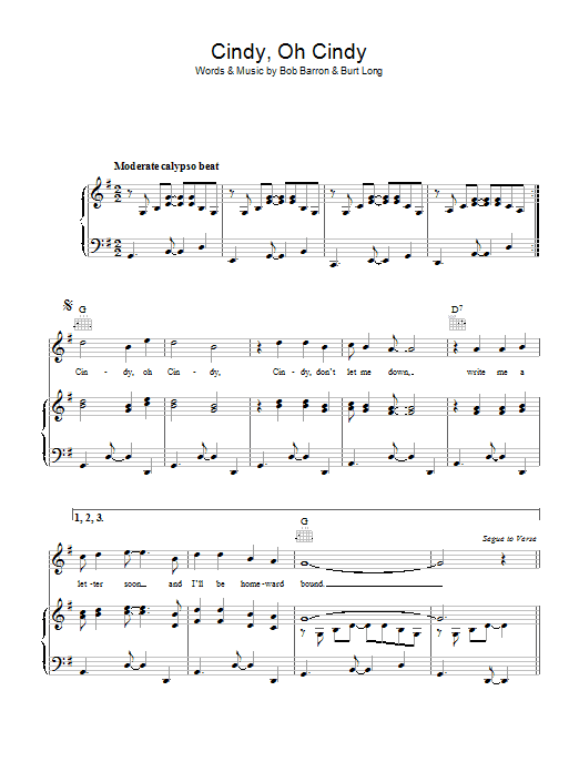 Download or print Bob Barron Cindy, Oh Cindy sheet music, chords and digital score arranged for Piano, Vocal & Guitar Chords. This Standards score includes 3 page(s).