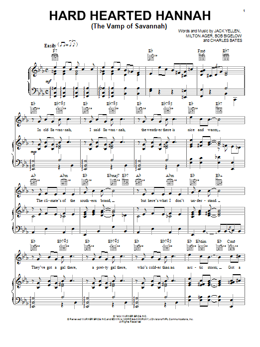 Download or print Bob Bigelow Hard Hearted Hannah (The Vamp Of Savannah) sheet music, chords and digital score arranged for Piano, Vocal & Guitar Chords (Right-Hand Melody). This Jazz score includes 3 page(s).