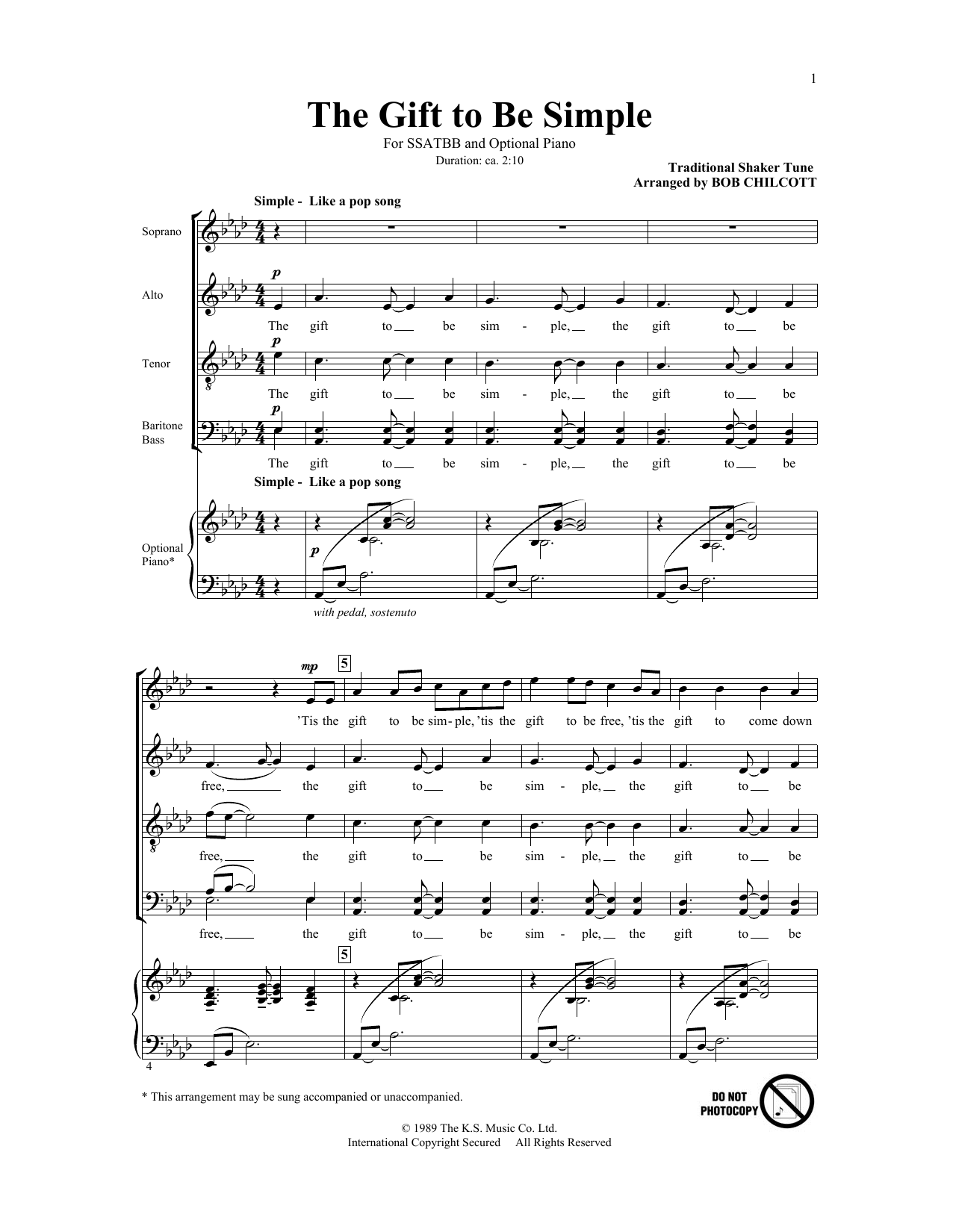 Download or print Bob Chilcott The Gift To Be Simple sheet music, chords and digital score arranged for SATB Choir. This Folk score includes 7 page(s).