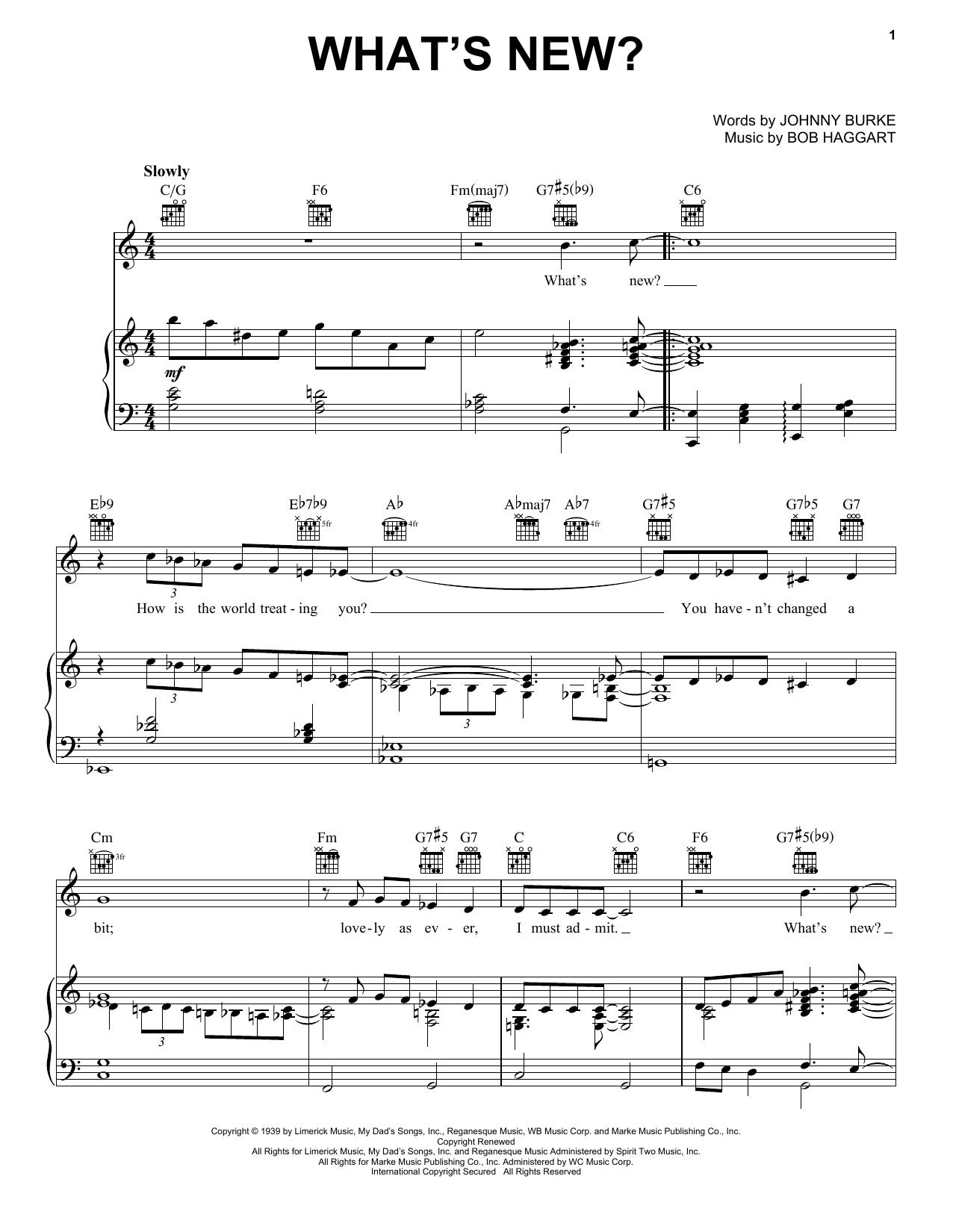 Download or print Bob Crosby and His Orchestra What's New? sheet music, chords and digital score arranged for Piano, Vocal & Guitar Chords (Right-Hand Melody). This Jazz score includes 3 page(s).