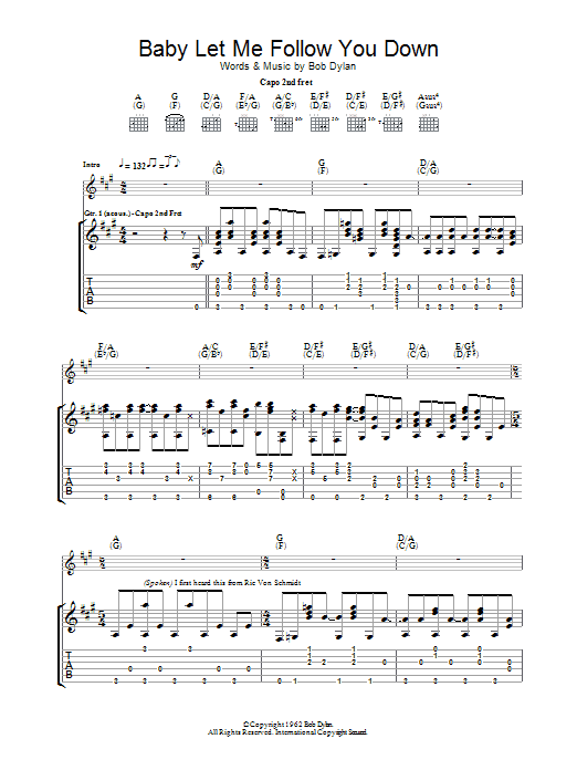 Download or print Bob Dylan Baby Let Me Follow You Down sheet music, chords and digital score arranged for Guitar Tab. This Folk score includes 4 page(s).