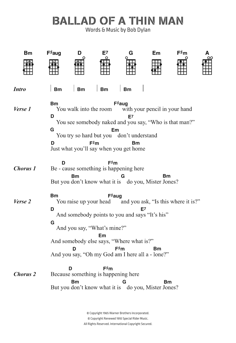 Download or print Bob Dylan Ballad Of A Thin Man sheet music, chords and digital score arranged for Piano, Vocal & Guitar Chords. This Folk score includes 3 page(s).
