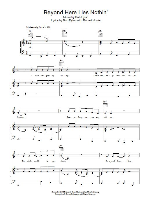 Download or print Bob Dylan Beyond Here Lies Nothin' sheet music, chords and digital score arranged for Piano, Vocal & Guitar Chords. This Folk score includes 2 page(s).