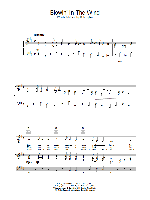 Download or print Bob Dylan Blowin' In The Wind sheet music, chords and digital score arranged for Piano, Vocal & Guitar Chords. This Folk score includes 2 page(s).