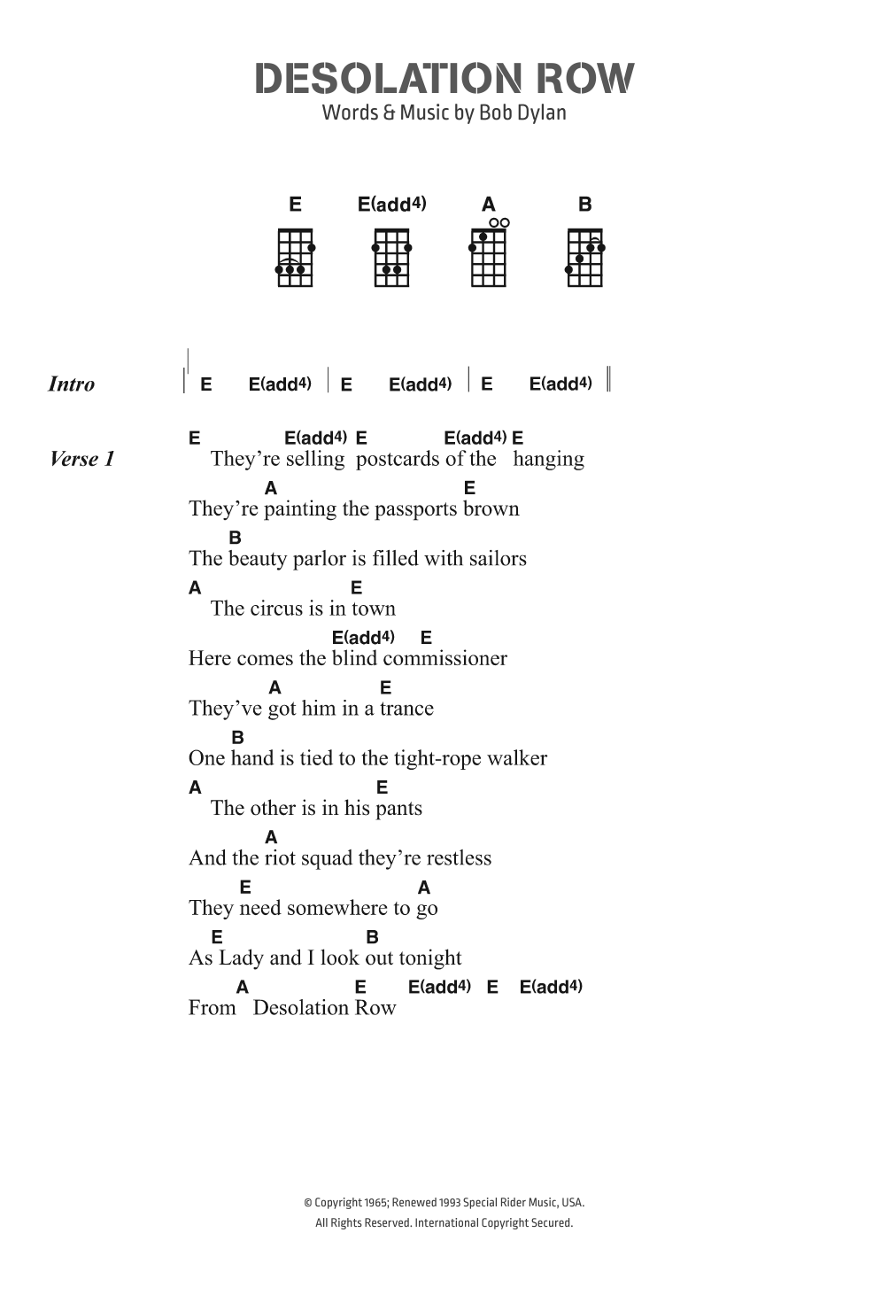 Download or print Bob Dylan Desolation Row sheet music, chords and digital score arranged for Piano, Vocal & Guitar Chords. This Folk score includes 6 page(s).