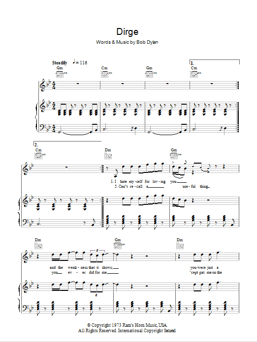 Download or print Bob Dylan Dirge sheet music, chords and digital score arranged for Piano, Vocal & Guitar Chords. This Folk score includes 10 page(s).