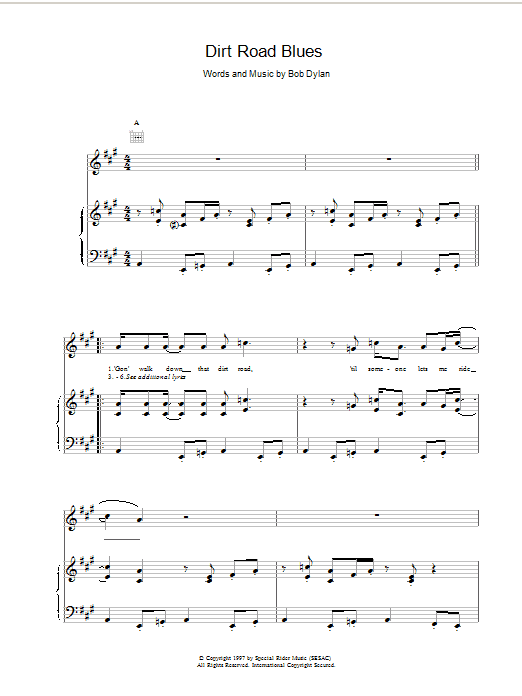 Download or print Bob Dylan Dirt Road Blues sheet music, chords and digital score arranged for Piano, Vocal & Guitar Chords. This Folk score includes 4 page(s).
