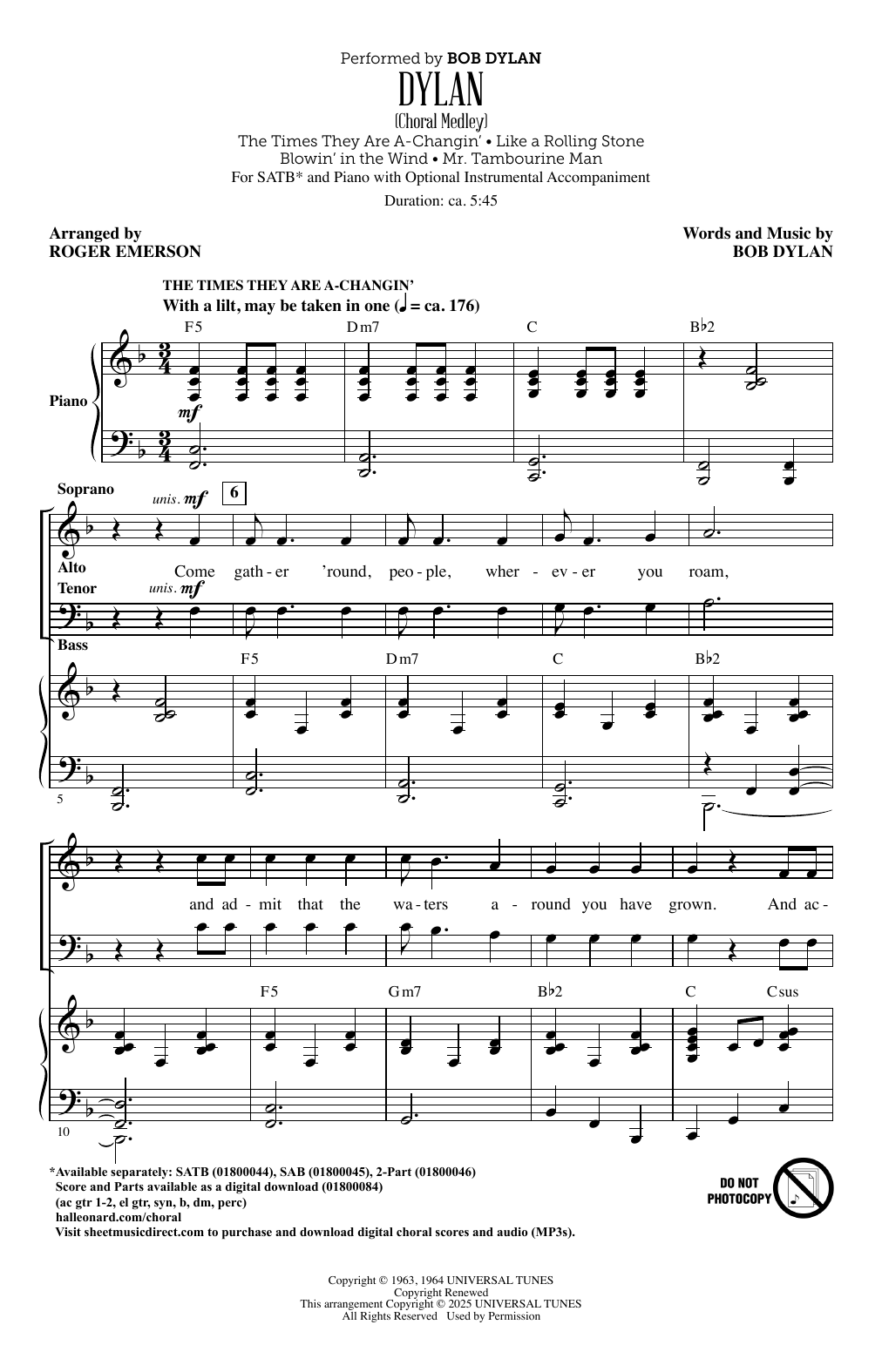 Download or print Bob Dylan Dylan (Choral Medley) (arr. Roger Emerson) sheet music, chords and digital score arranged for SAB Choir. This Pop score includes 18 page(s).