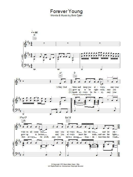 Download or print Bob Dylan Forever Young sheet music, chords and digital score arranged for Really Easy Piano. This Rock score includes 2 page(s).