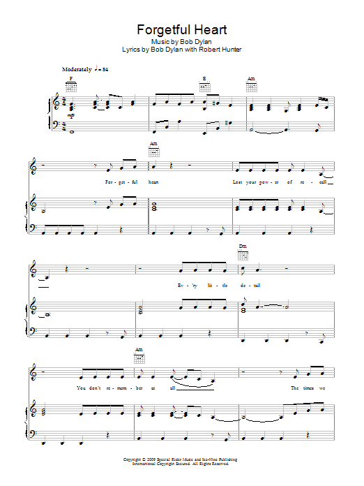 Download or print Bob Dylan Forgetful Heart sheet music, chords and digital score arranged for Piano, Vocal & Guitar Chords. This Folk score includes 4 page(s).