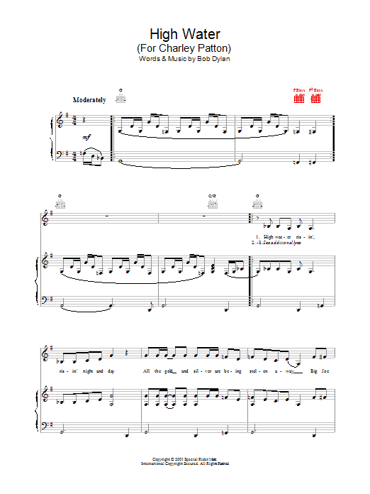 Download or print Bob Dylan High Water (For Charley Patton) sheet music, chords and digital score arranged for Guitar Chords/Lyrics. This Rock score includes 3 page(s).