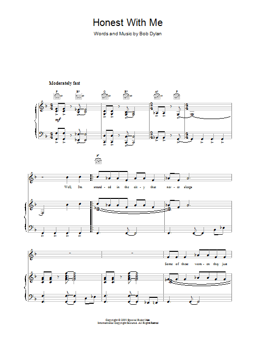 Download or print Bob Dylan Honest With Me sheet music, chords and digital score arranged for Piano, Vocal & Guitar Chords. This Folk score includes 4 page(s).