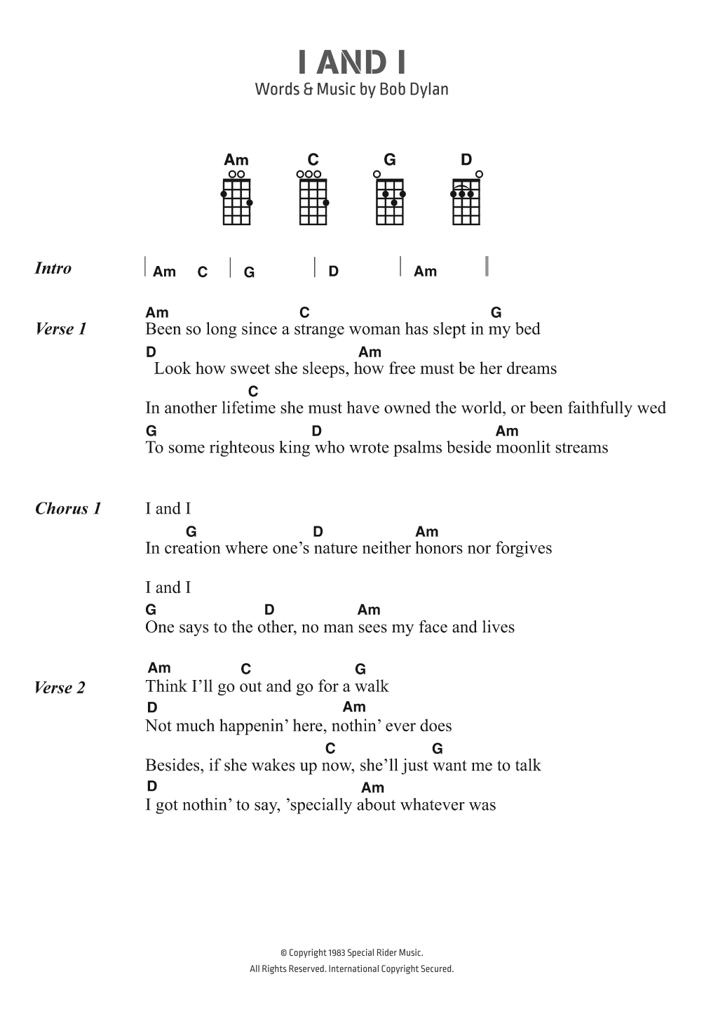 Download or print Bob Dylan I And I sheet music, chords and digital score arranged for Piano, Vocal & Guitar Chords. This Folk score includes 2 page(s).