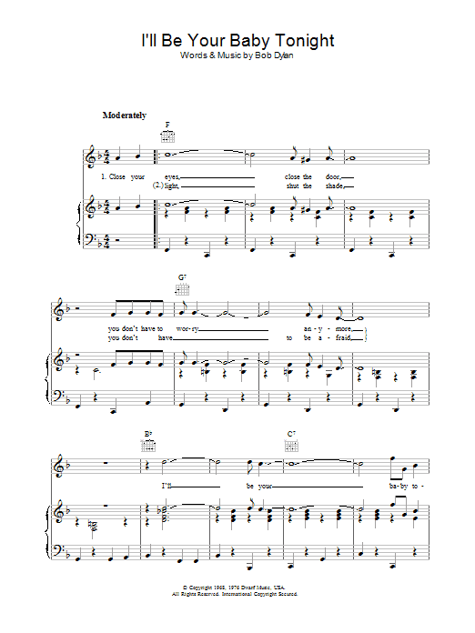 Download or print Bob Dylan I'll Be Your Baby Tonight sheet music, chords and digital score arranged for Piano, Vocal & Guitar Chords (Right-Hand Melody). This Folk score includes 3 page(s).