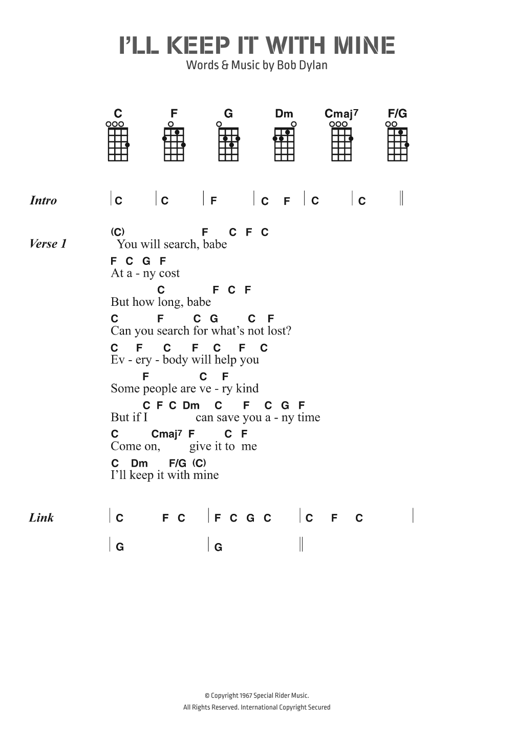 Download or print Bob Dylan I'll Keep It With Mine sheet music, chords and digital score arranged for Ukulele Chords/Lyrics. This Folk score includes 2 page(s).