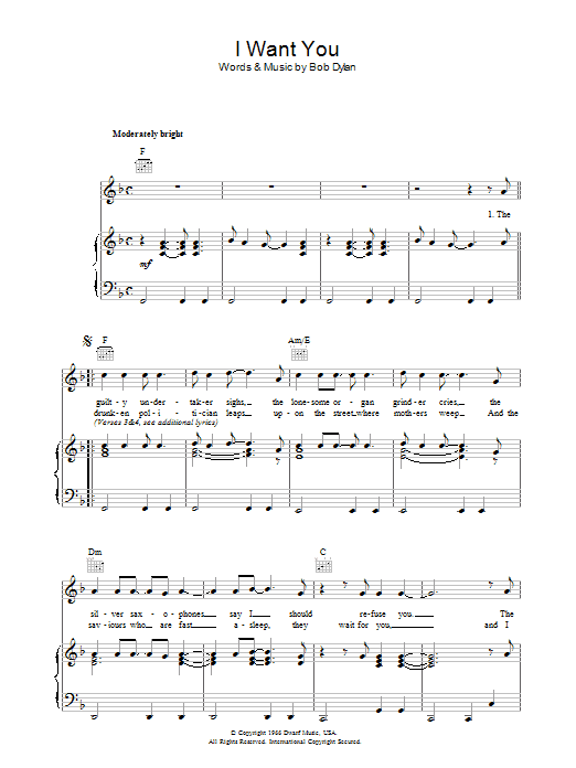 Download or print Bob Dylan I Want You sheet music, chords and digital score arranged for Guitar Chords/Lyrics. This Rock score includes 2 page(s).
