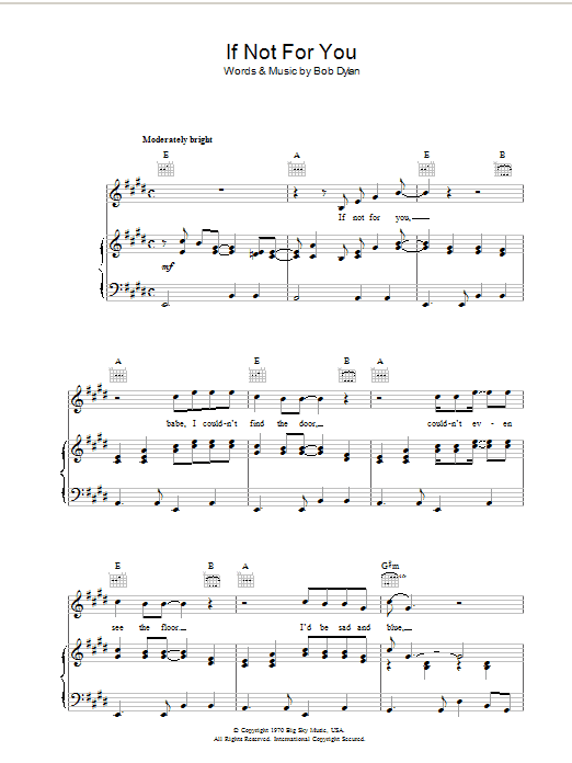Download or print Bob Dylan If Not For You sheet music, chords and digital score arranged for Piano, Vocal & Guitar Chords (Right-Hand Melody). This Folk score includes 6 page(s).