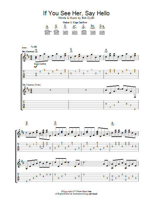 Download or print Bob Dylan If You See Her, Say Hello sheet music, chords and digital score arranged for Guitar Tab. This Folk score includes 6 page(s).