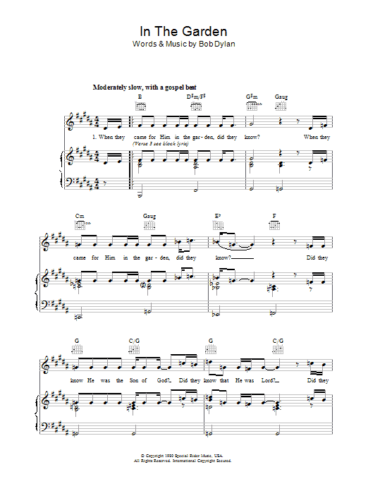 Download or print Bob Dylan In The Garden sheet music, chords and digital score arranged for Piano, Vocal & Guitar Chords. This Folk score includes 4 page(s).