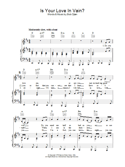 Download or print Bob Dylan Is Your Love In Vain sheet music, chords and digital score arranged for Guitar Chords/Lyrics. This Rock score includes 2 page(s).