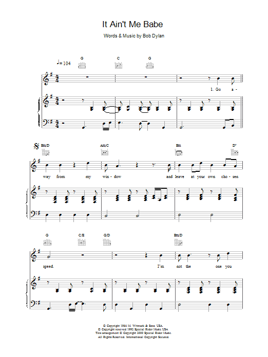 Download or print Bob Dylan It Ain't Me Babe sheet music, chords and digital score arranged for Piano & Vocal. This Folk score includes 2 page(s).