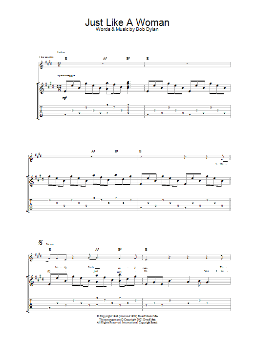 Download or print Bob Dylan Just Like A Woman sheet music, chords and digital score arranged for Guitar Chords/Lyrics. This Rock score includes 3 page(s).