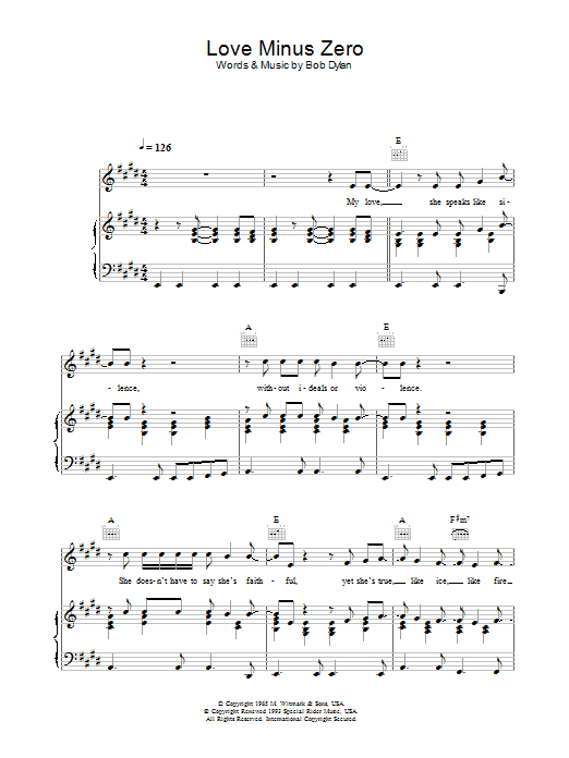 Download or print Bob Dylan Love Minus Zero/No Limit sheet music, chords and digital score arranged for Guitar Chords/Lyrics. This Folk score includes 2 page(s).