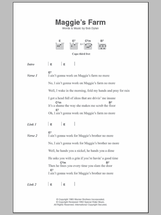 Download or print Bob Dylan Maggie's Farm sheet music, chords and digital score arranged for Guitar Chords/Lyrics. This Folk score includes 2 page(s).