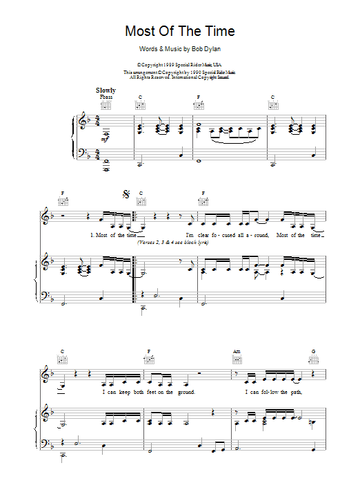 Download or print Bob Dylan Most Of The Time sheet music, chords and digital score arranged for Piano, Vocal & Guitar Chords. This Folk score includes 2 page(s).