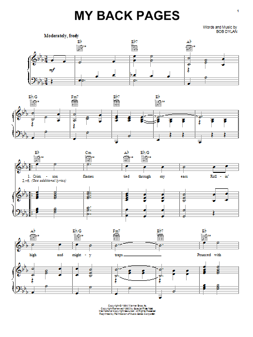 Download or print Bob Dylan My Back Pages sheet music, chords and digital score arranged for Piano, Vocal & Guitar Chords. This Folk score includes 3 page(s).