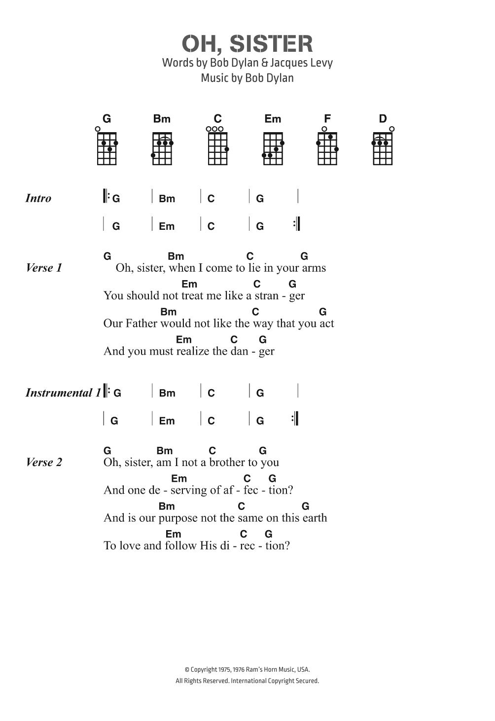 Download or print Bob Dylan Oh, Sister sheet music, chords and digital score arranged for Ukulele Chords/Lyrics. This Folk score includes 2 page(s).