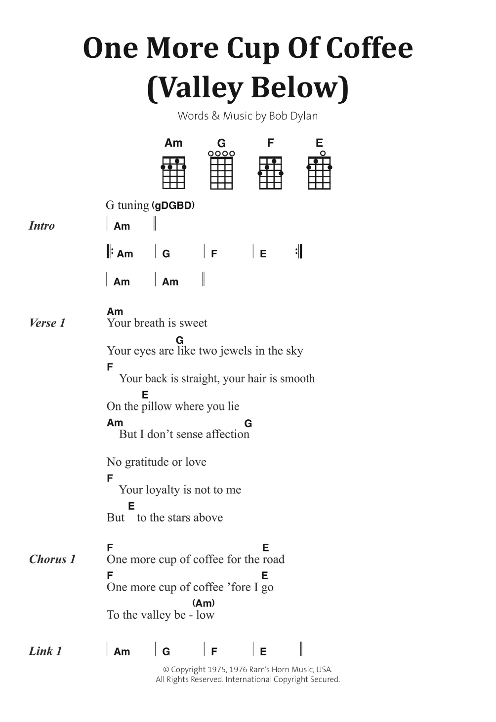 Download or print Bob Dylan One More Cup Of Coffee (Valley Below) sheet music, chords and digital score arranged for Piano, Vocal & Guitar Chords. This Folk score includes 2 page(s).