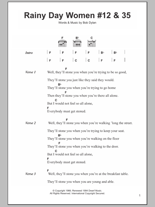 Download or print Bob Dylan Rainy Day Women #12 & 35 sheet music, chords and digital score arranged for Guitar Chords/Lyrics. This Rock score includes 2 page(s).