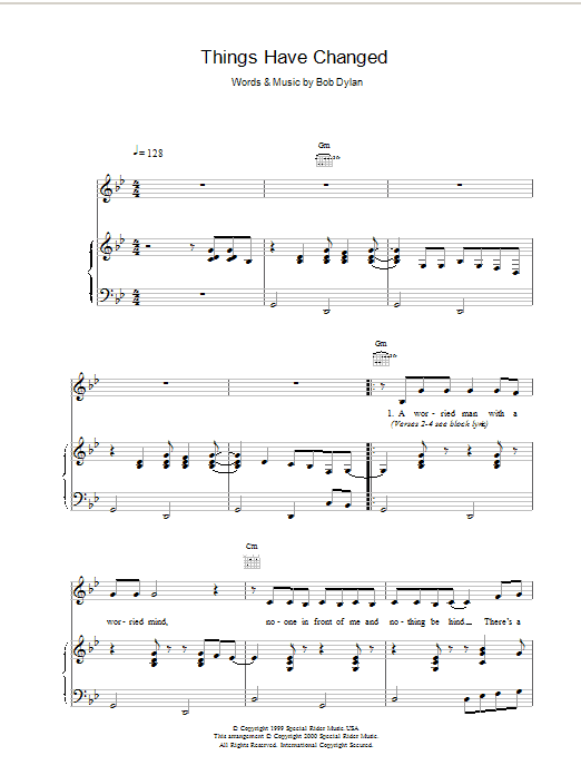 Download or print Bob Dylan Things Have Changed sheet music, chords and digital score arranged for Piano, Vocal & Guitar Chords. This Folk score includes 3 page(s).