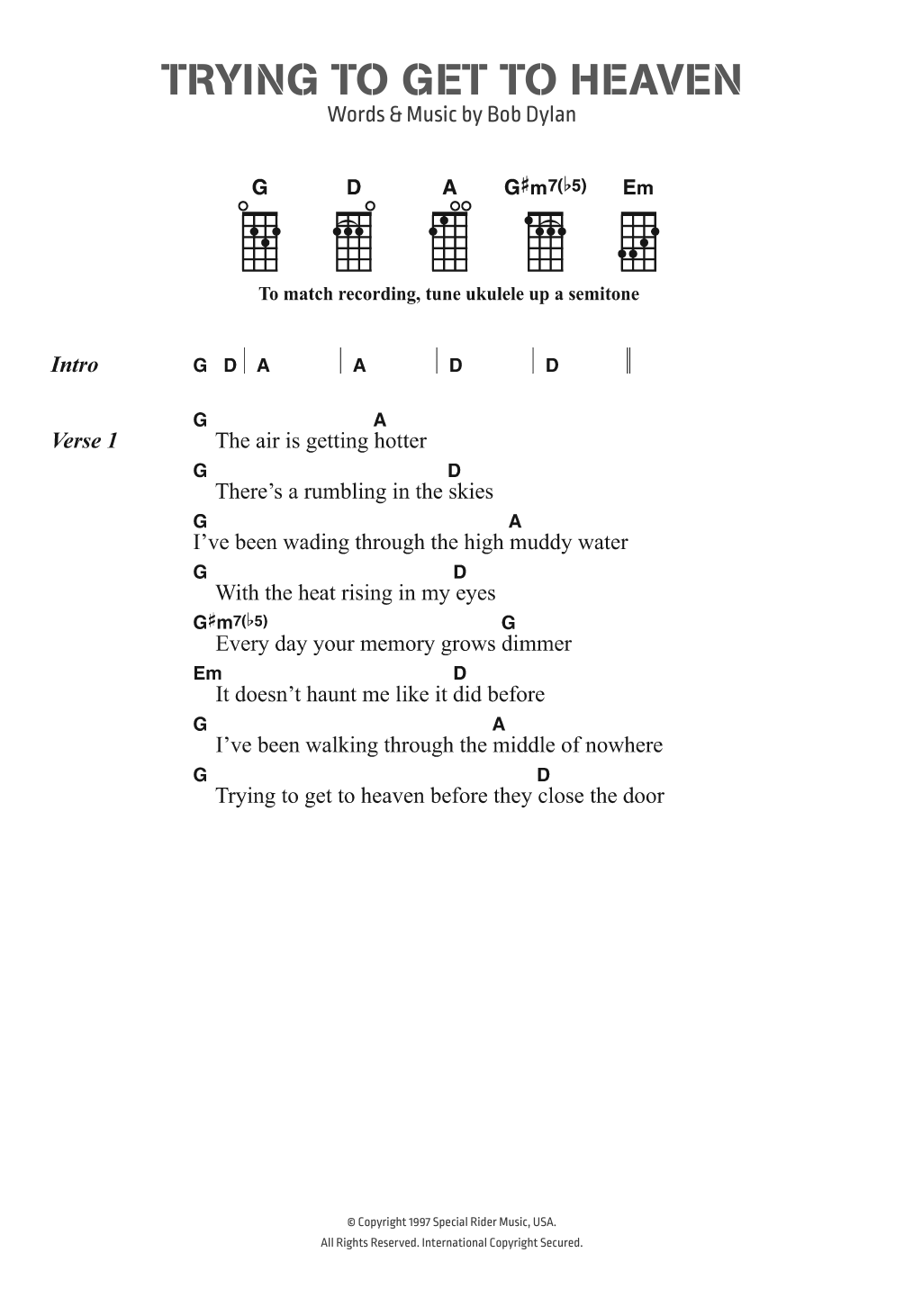 Download or print Bob Dylan Trying To Get To Heaven sheet music, chords and digital score arranged for Piano, Vocal & Guitar Chords. This Folk score includes 3 page(s).