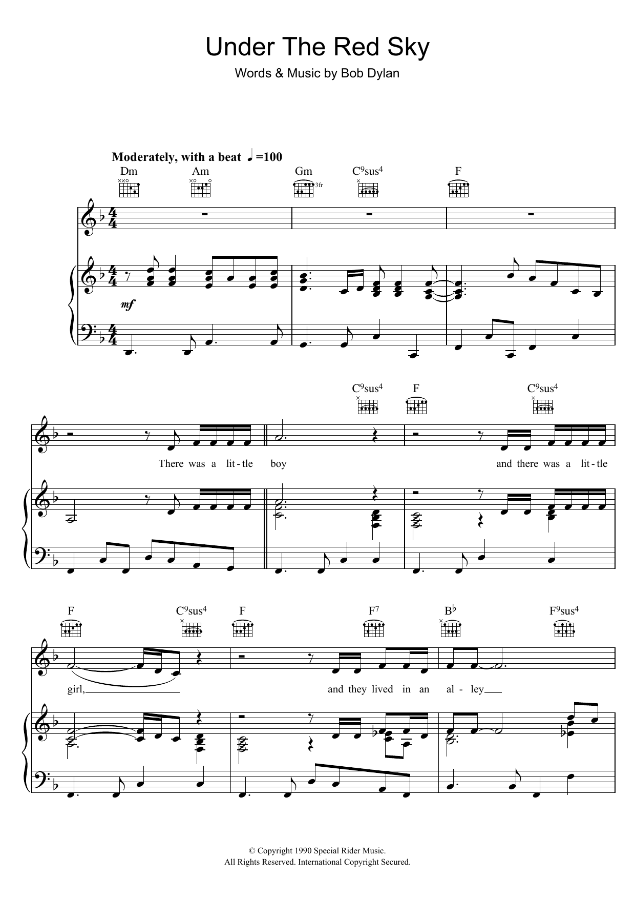 Download or print Bob Dylan Under The Red Sky sheet music, chords and digital score arranged for Piano, Vocal & Guitar Chords. This Folk score includes 5 page(s).