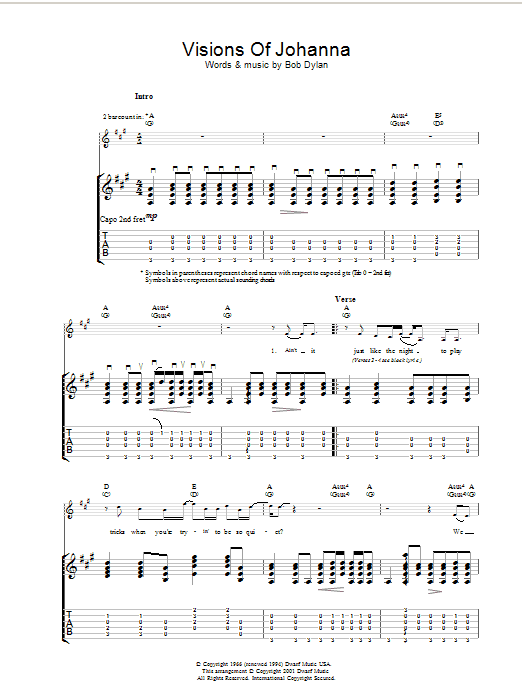 Download or print Bob Dylan Visions Of Johanna sheet music, chords and digital score arranged for Guitar Tab. This Rock score includes 8 page(s).