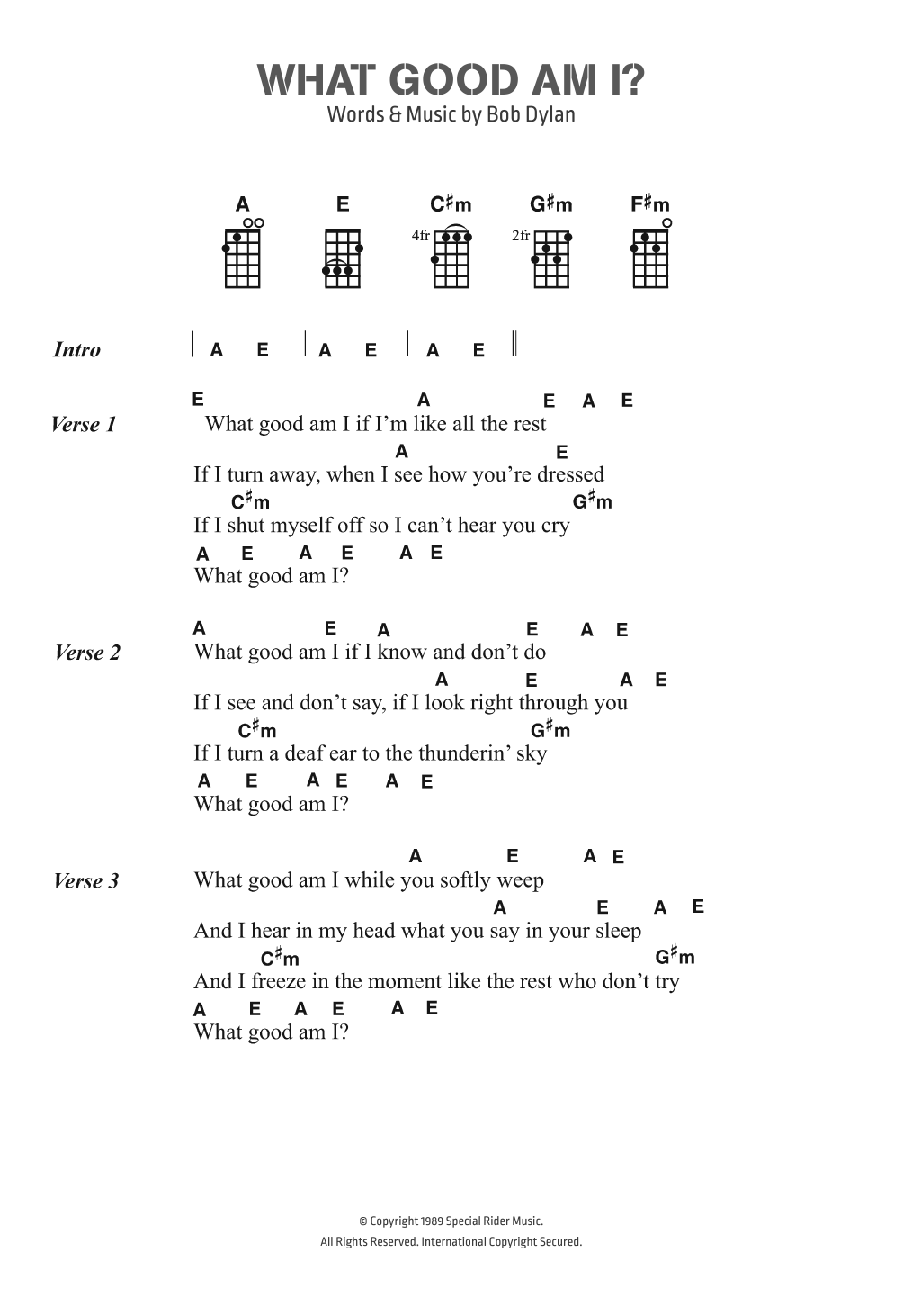 Download or print Bob Dylan What Good Am I? sheet music, chords and digital score arranged for Ukulele Chords/Lyrics. This Folk score includes 2 page(s).